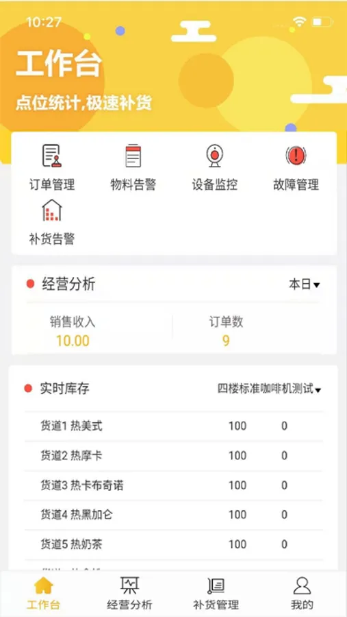 该系统主要功能包括首页、补货管理、货道配置、营销管理、订单管理、设备监控、设备调货、经营分析、故障管理、线下收款等功能。为销售管理人员提供全方面的运营管理功能,可为在外作业时的销售管理人员,提供快捷方便的终端管理操作。