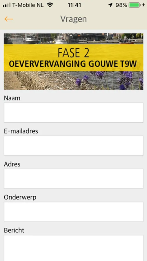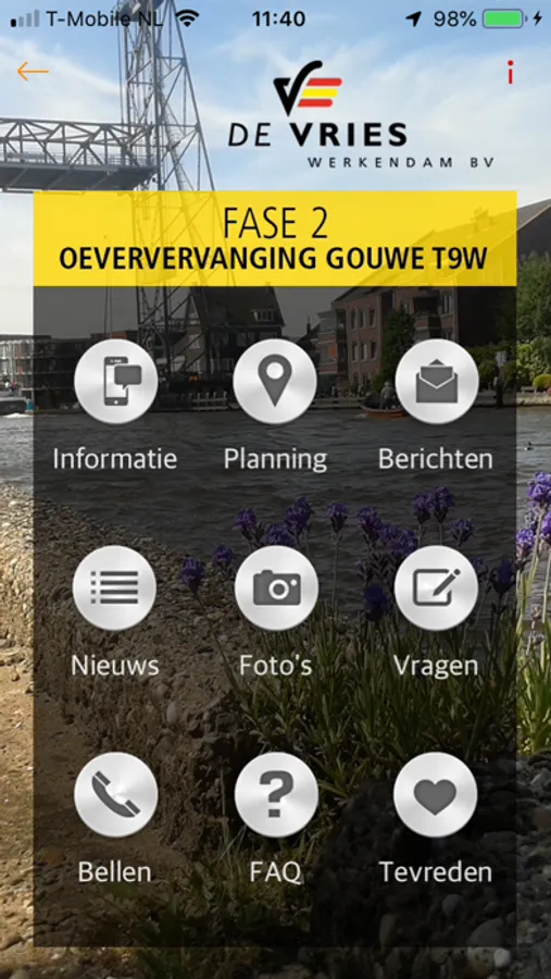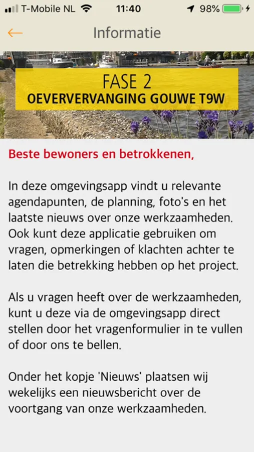 In deze app vindt u alle informatie over de werkzaamheden van het project Oeververvanging Gouwe T9W fase 2. Er worden relevante agenda puntjes, de laatste planning en contactinformatie weergegeven . Ook kunt u op deze app vragen, opmerkingen of klachten achterlaten die betrekking hebben op het project.