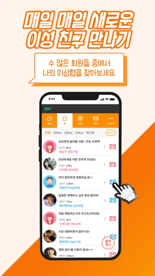 - 토크메뉴에는 본인이 위치한 곳과 가까운 거리순으로 게시된 톡글을 소팅(sorting)해서 볼 수 있어 진짜 가까이 있는 사람을 동네친구로 만들 수 있으며 가까운 거리에 있는 이성과 심쿵한 인연을 만들수도 있는 진짜 가성비 “갑” 무료채팅앱이라고 자부할 수 있습니다.