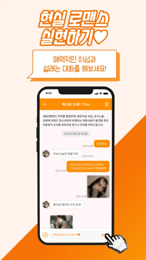 3. 음란하거나 선정적인 프로필 사진 및 성기∙성행위를 비유해서 불건전 만남을 유도하는 게시글은 본 서비스에서 유통을 금지합니다.