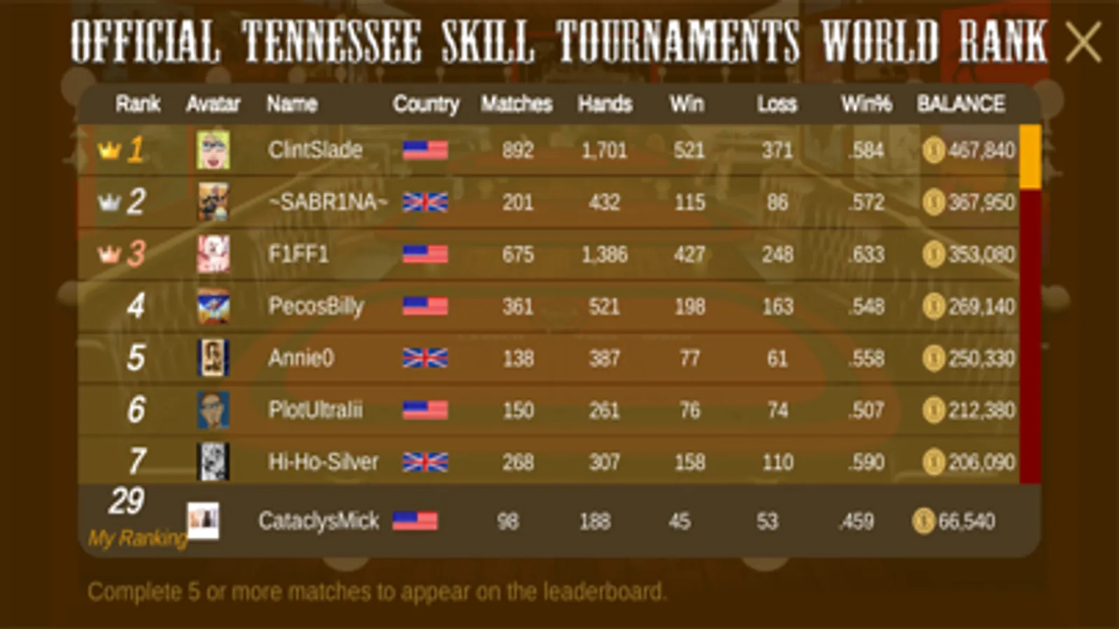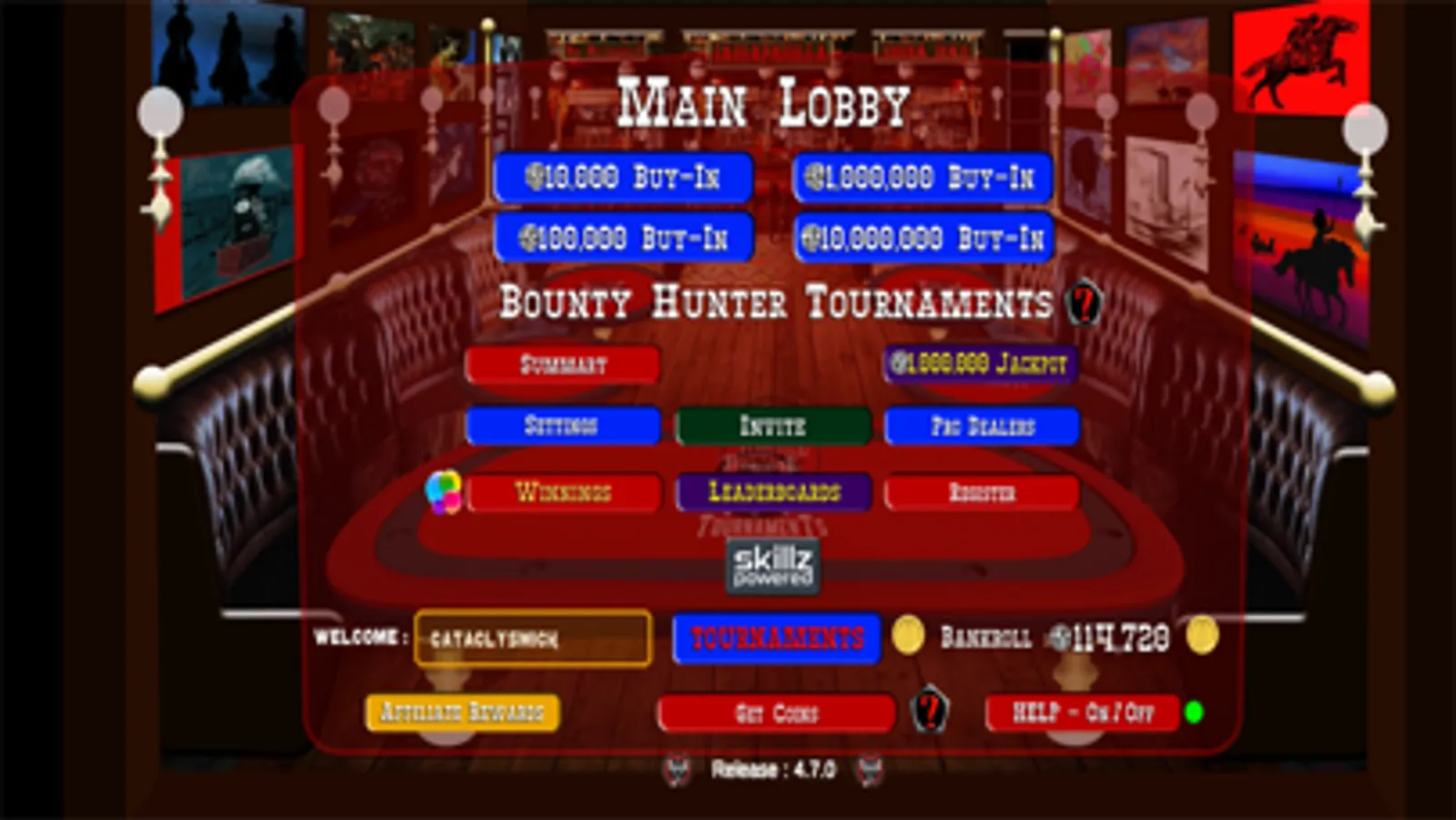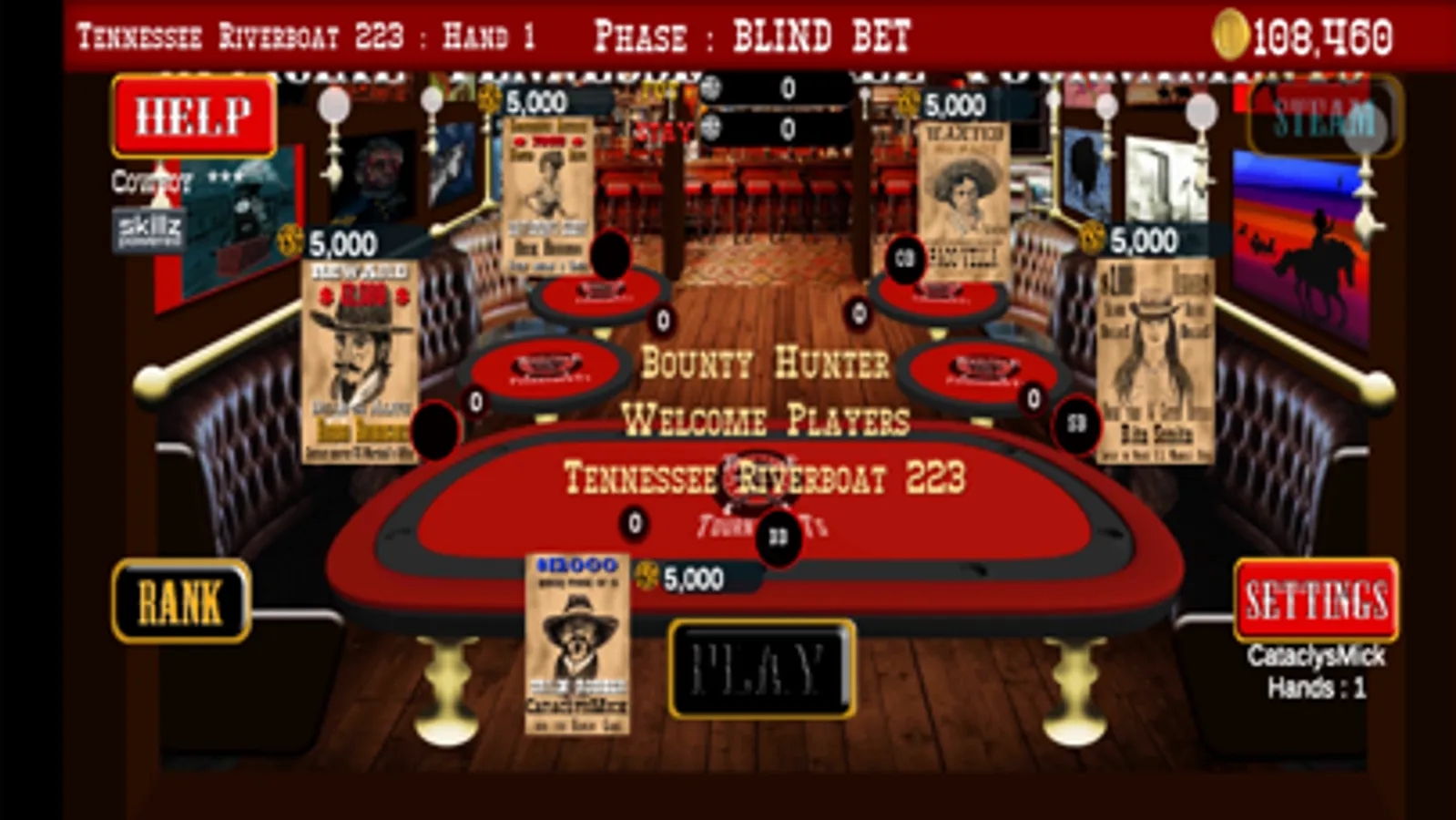 * You must ‘Capture’ (Bankrupt) your Outlaw Opponents to collect their Bounty. Win Tournaments to collect Gold and Silver to top the Medals Leaderboard and to raise your World Ranking. Build your Bankroll to play at the Highest Level!