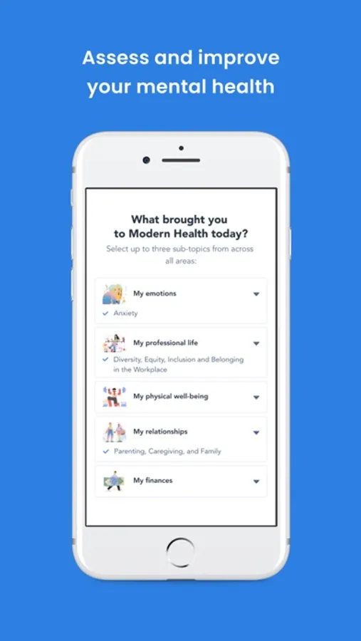 Modern Health offers a positive, proactive solution that helps you improve your mental health and well-being. In just a few minutes, you can start on your emotional well-being journey. Simply tell us what you want to work on and we’ll take it from there.