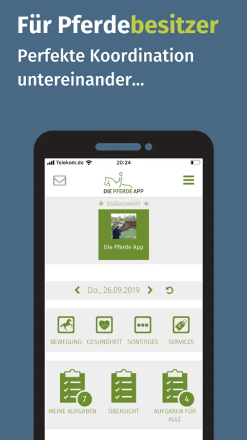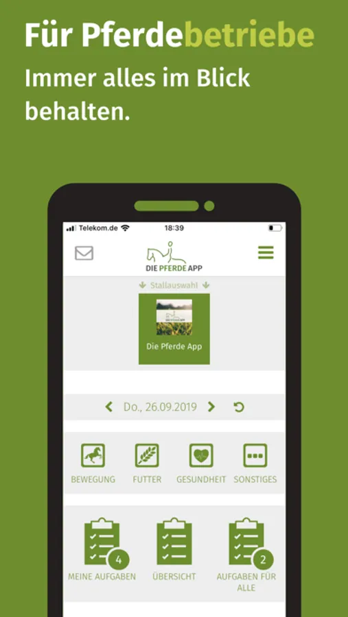 Mit der Pferde App haben Sie auch als Stallbetreiber alles Wichtige jederzeit zur Hand. Sie behalten den Überblick über die Aktivitäten rund um Pferde und Hof und können von überall auf die Aufgabenverteilung Einfluss nehmen.