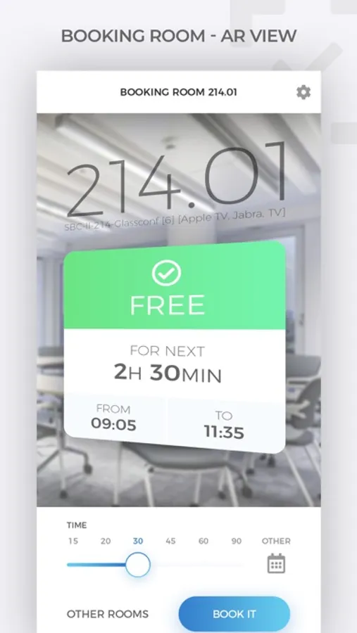 Bookado integrates with Office 365 and Google calendar. It is using AR-markers and QR-codes to identify the meeting room and present the room availability data in Augmented Reality!