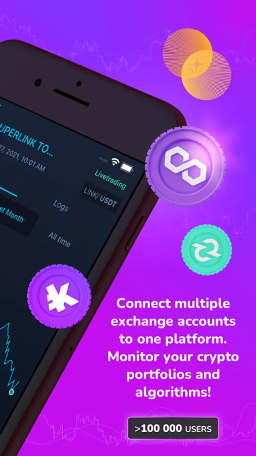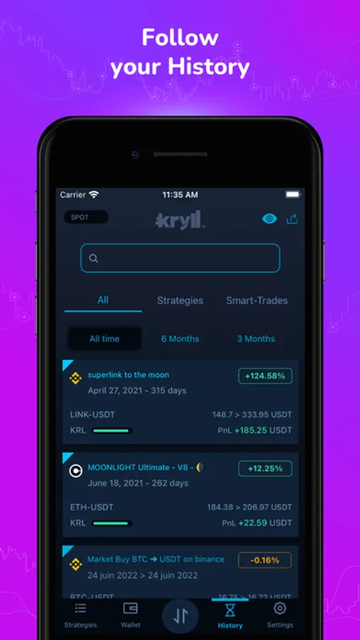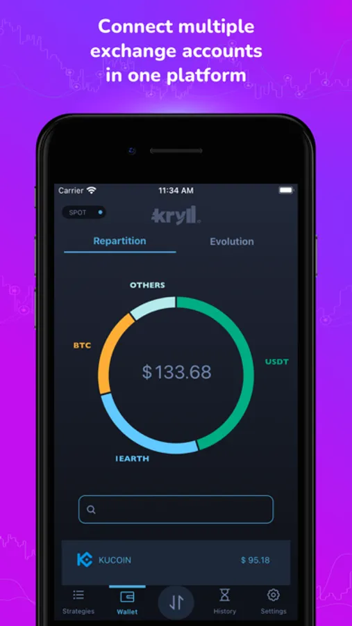 With Kryll.io, effortlessly manage your portfolio by centralizing exchanges on a single platform. Seamlessly integrate with leading crypto exchanges like Binance, Kucoin, ByBit, and more using Kryll.io's platform, managing all your exchange accounts from a single app and take advantage of our free swap feature