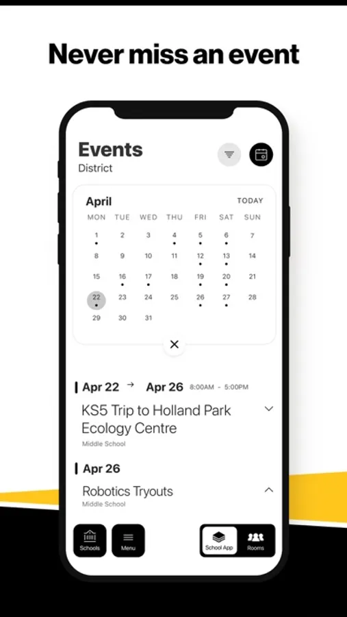 The event section shows a list of events throughout the district. Users can add an event to your calendar to share the event with friends and family with one tap.