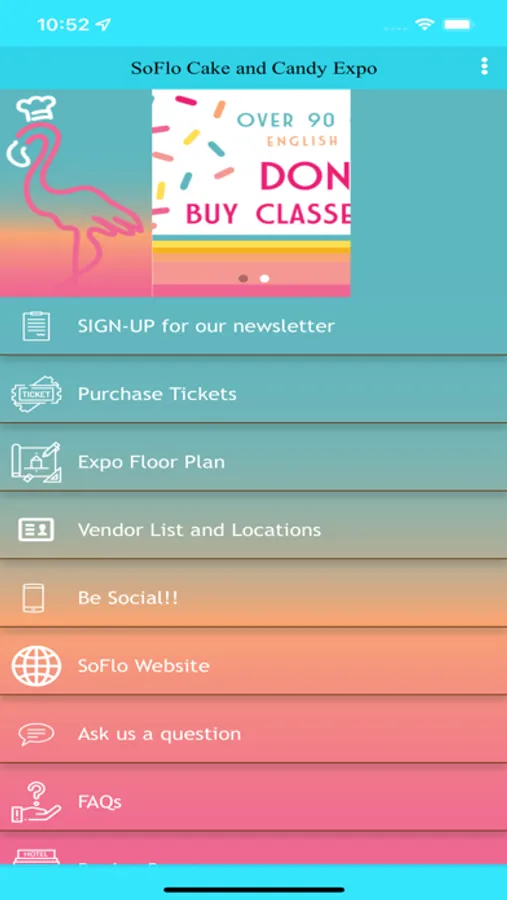 Informational App for soflo cake and candy expo trade show. This app contains links to purchase tickets. It also contains information about the show and links to the show website.
