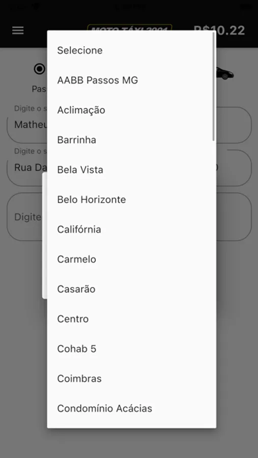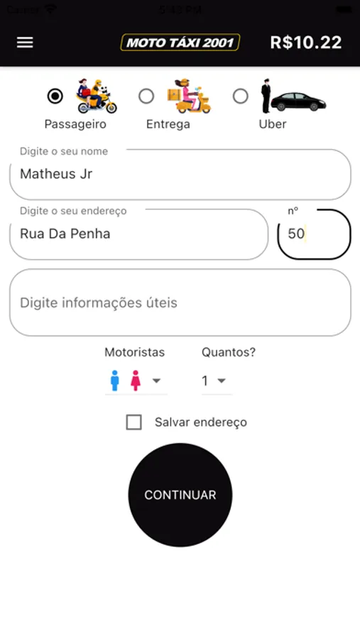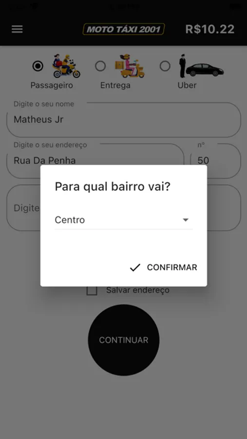 Aplicativo feito para o pedido de corridas, com ele você pode pedir no dinheiro, cartão ou no seu saldo de Cashback, você pede a corrida e recebe parte do valor dela de volta.