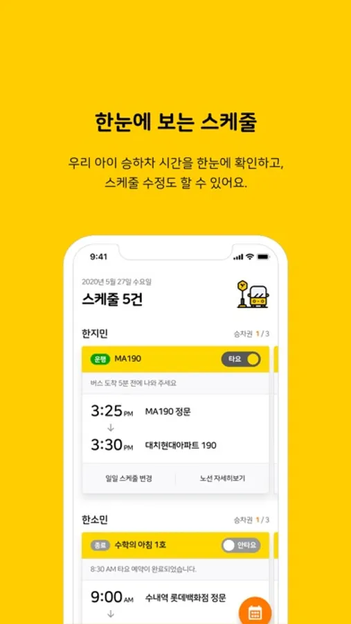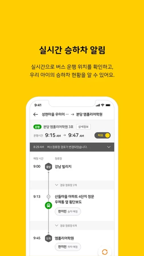 - 버스 운행 현황을 실시간으로 확인하고, 자녀의 승하차 알림도 받을 수 있습니다.