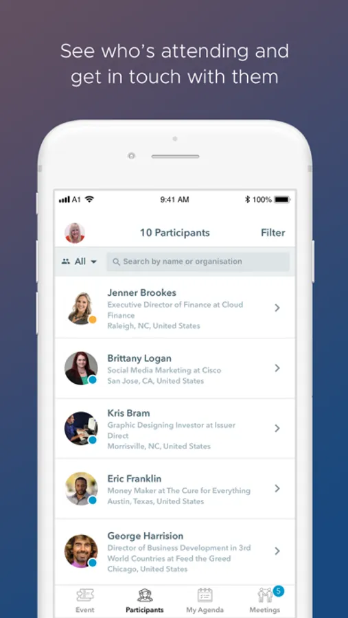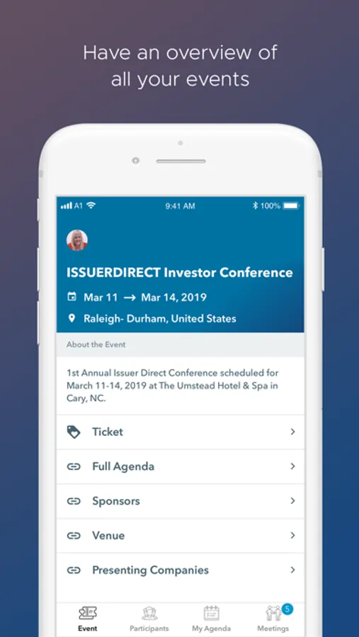 This app enables you to directly message other participants and book 1:1 meetings during a conference. It also provides you with your personal agenda that includes all your meetings, panel discussions and sessions. This app delivers all the vital information needed for a seamless event experience.