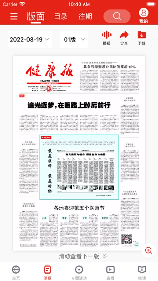 《健康报》面向健康报订阅用户,现与纸质刊物同步发行,为用户提供阅读、收听、下载、收藏、分享、关注等功能。