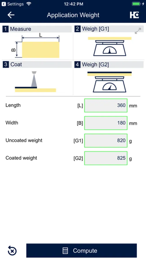 • By entering the work piece dimensions, the weight of the uncoated as well as the coated work piece, the app determines the applied application quantity.