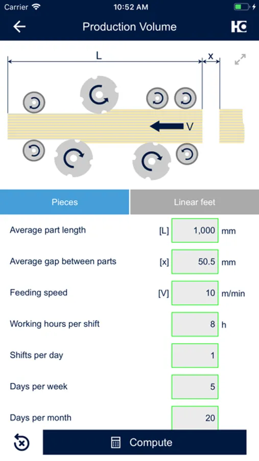 - On the basis of entered data on workpiece dimensions, feed rate and working time, the app roughly calculates the number of workpieces produced per day, per week and per month.