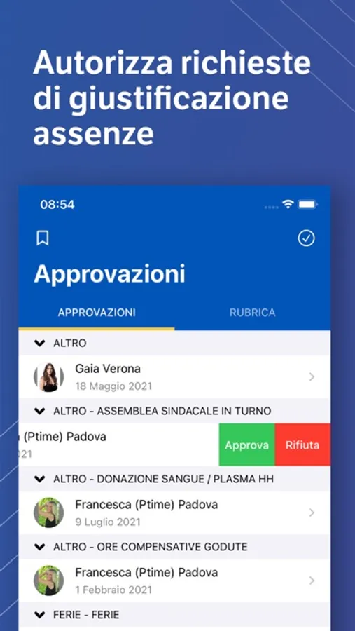 - richiedere giustificazioni per assenze diverse da ferie e permessi (es: permesso per donazione sangue, permesso per studio, permessi L.104) e consultare lo stato delle relative autorizzazioni
