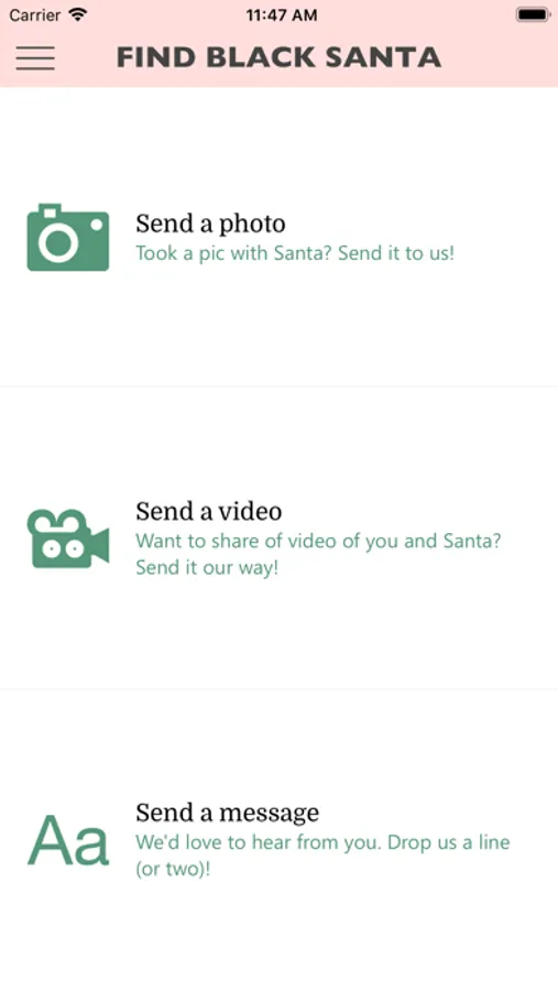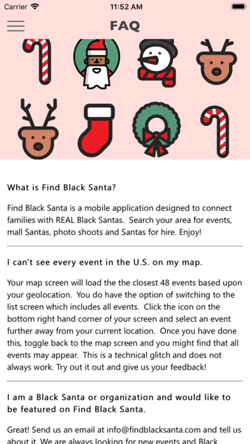 Find Black Santa connects users with local holiday experiences that feature Black Santas. Whether you’re needing to take family photos with Santa at your local mall, hire Santa to host your holiday party or have breakfast with Santa, Find Black Santa is your local guide for finding the perfect Christmas entertainment.