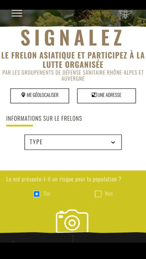Cette application, qui dispose d'une fonction de géolocalisation, permet de déclarer la présence de nids ou d'individus. Elle est uniquement réservée au frelon asiatique.
