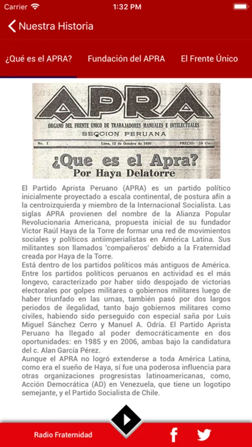 Esta aplicación esta destinada para promover el partido político aprista peruano, cuenta con noticias, eventos, información actualizada, una radio via streaming y una biblioteca de musica, videos y libros.