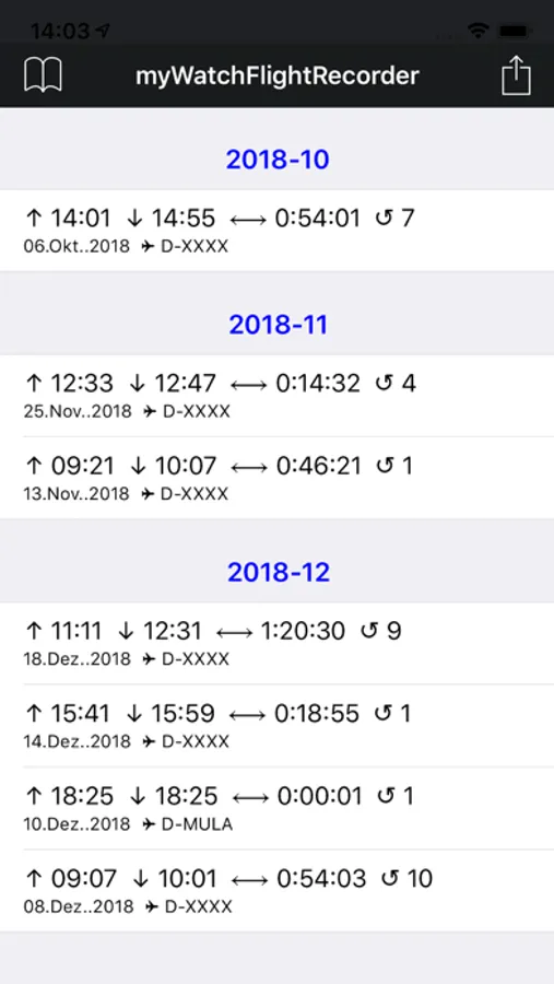 myWatchFlight Recorder is an app for AppleWatch with which you can easily log your flights. When starting, simply log the take-off time in UTC with the START button, then add a landing with the + button for each landing, and log the end time with the STOP button. Now only transfer with the SEND button and the flight is stored in the app on the iPhone.