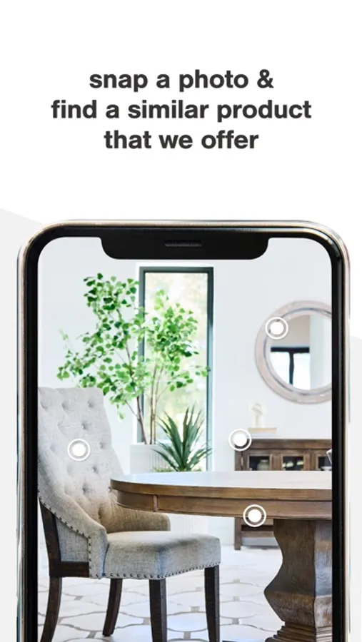 Our visual search feature lets you take a photo right in our app, or upload from your library, and instantly match what’s in your photo with our wide assortment of the latest home furnishing styles.