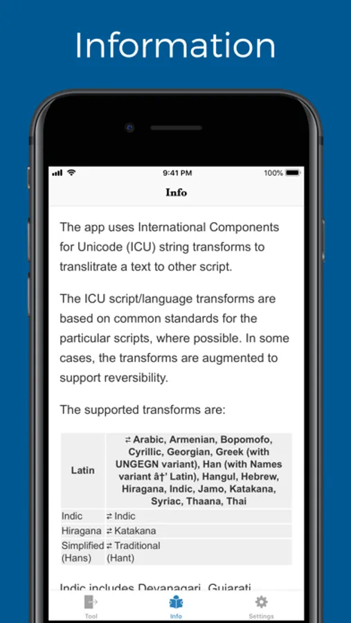 This app uses International Components for Unicode (ICU) to transliterate a text to other script.