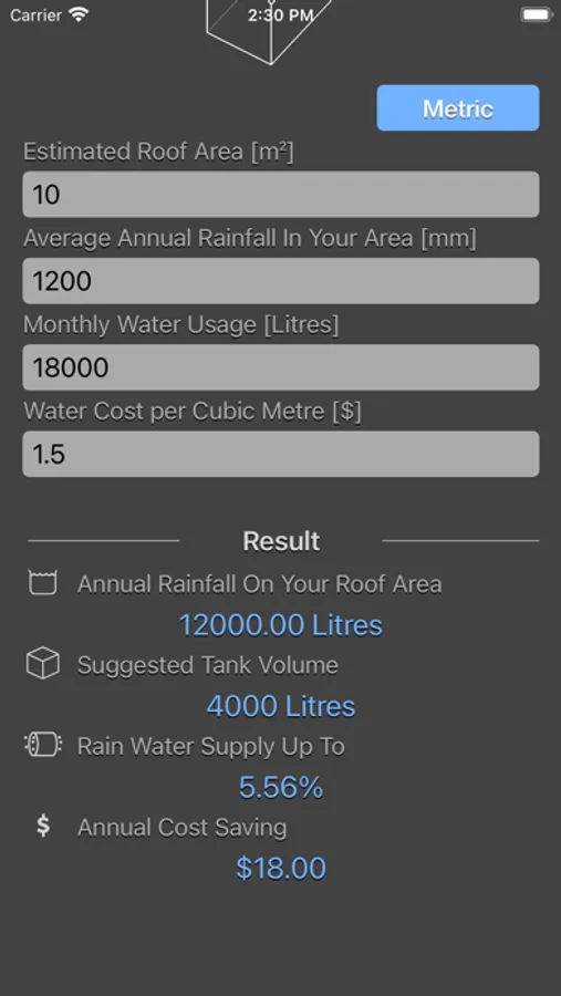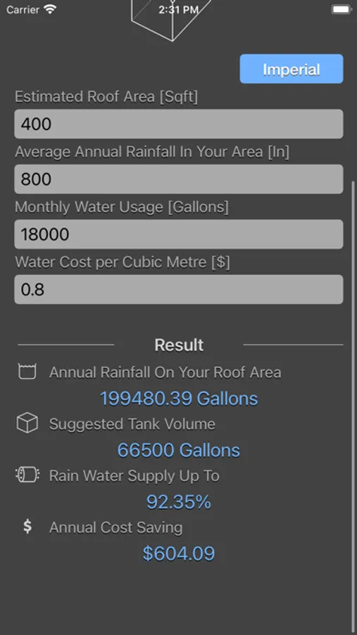 Rainfall Calculator are physic/math calculator to find how many litres of rain water you can harvest per year, evaluate the cost savings and also recommend the minimum tank size for water storage.