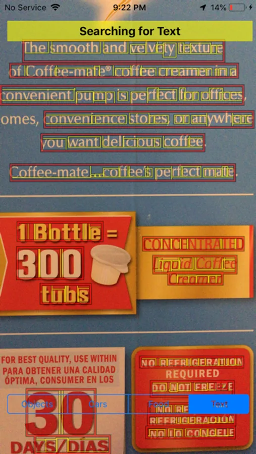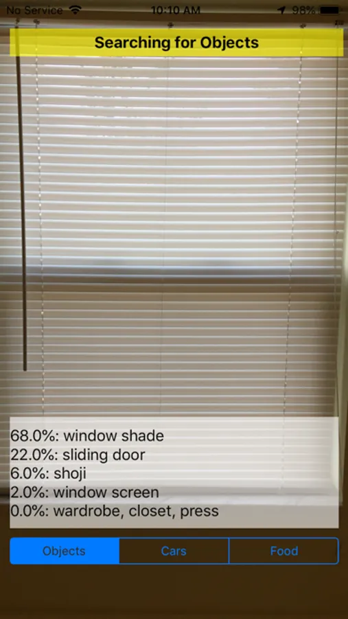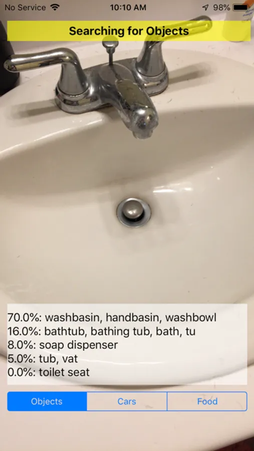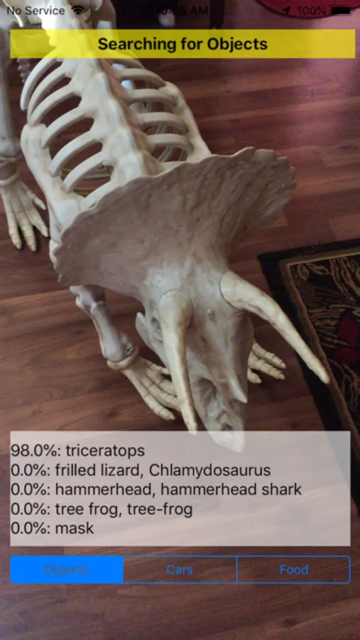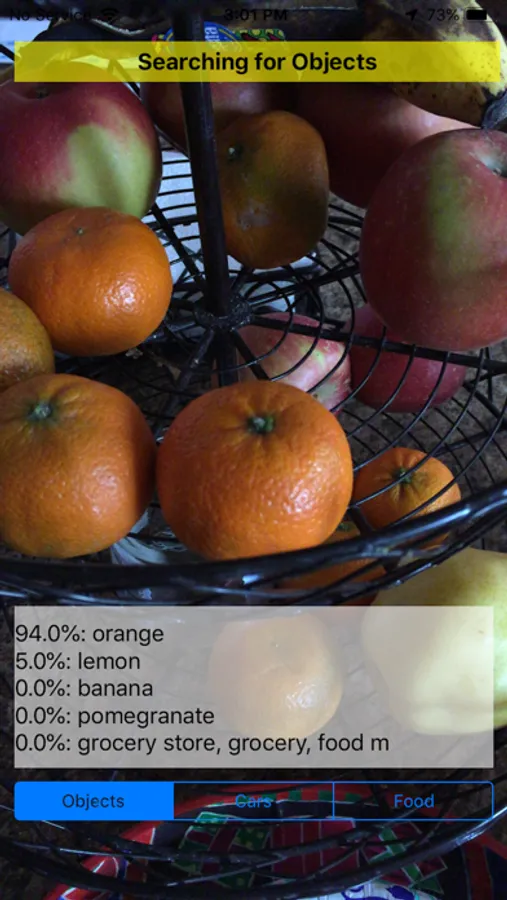 ML Image Identifier is an educational app that allows your iOS device to identify images in real-time, as you move the camera around your environment. It can scan for 3 categories of images ("Objects", "Cars", and "Food") and recognize "Text" (character boxes, OCR) and "Faces" (feature landmarks).