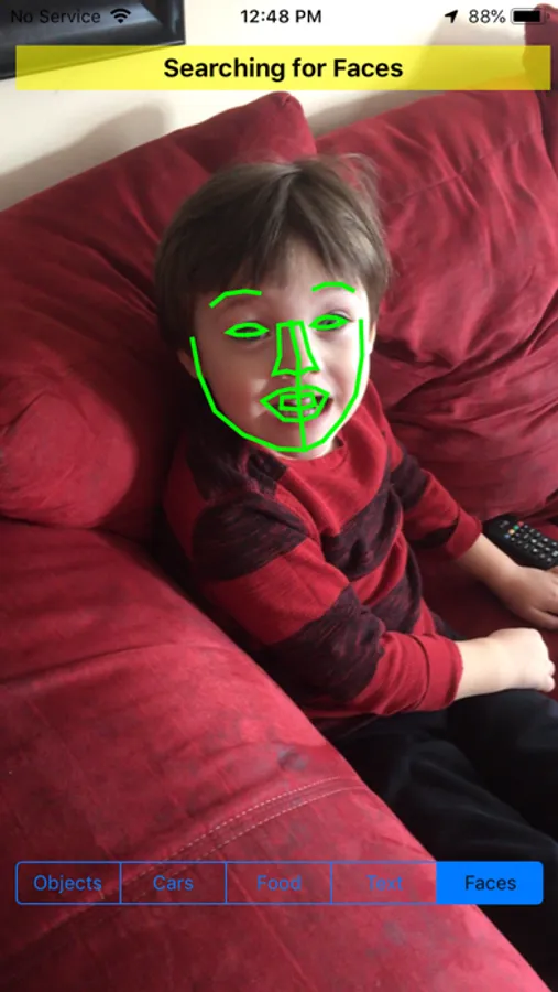 The facial-recognition mode looks for all potential human or human-like faces. Of those found, the app highlights the facial landmarks, such as eyes, nose, jawline, etc. This mode in particular works better on a newer device at a usable framerate, due to the hardware required for real-time image processing.