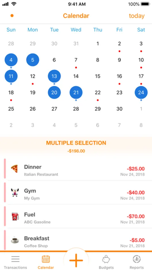 * Use calendar view to manage your every day expenses. Use the single selection to get all transactions of the day. Switch to the multiple selection and select all the days you want to get the total balance.