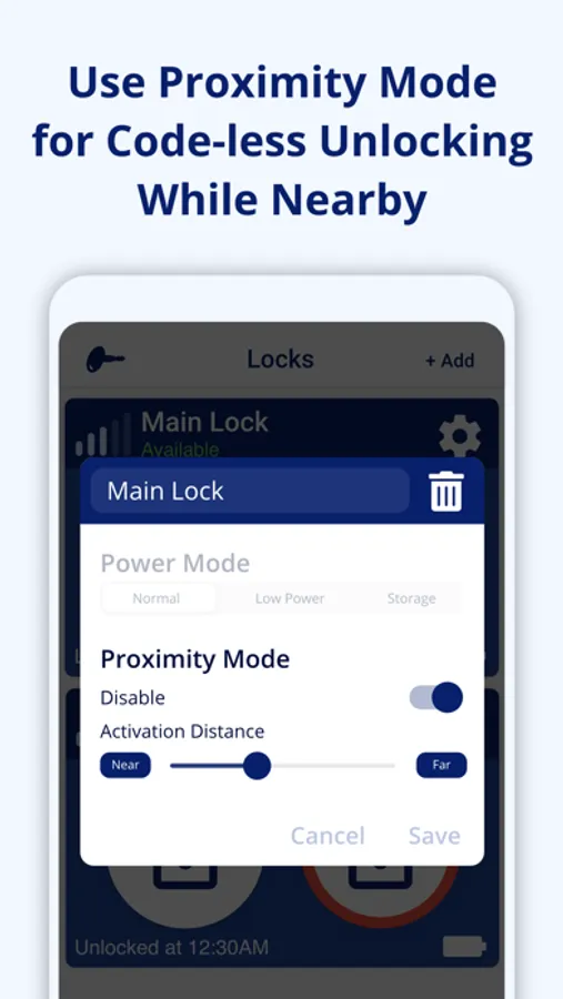 Proximity mode allows the user to unlock the lock without entering a code when their phone is nearby. This may be enabled or disabled in settings. The distance at which this mode becomes active is selectable by the user in the locks settings. Note: The actual activation distance may not be consistent for all phones. When the phone is in range and the mode is active, the lock will display a pulsing green border.