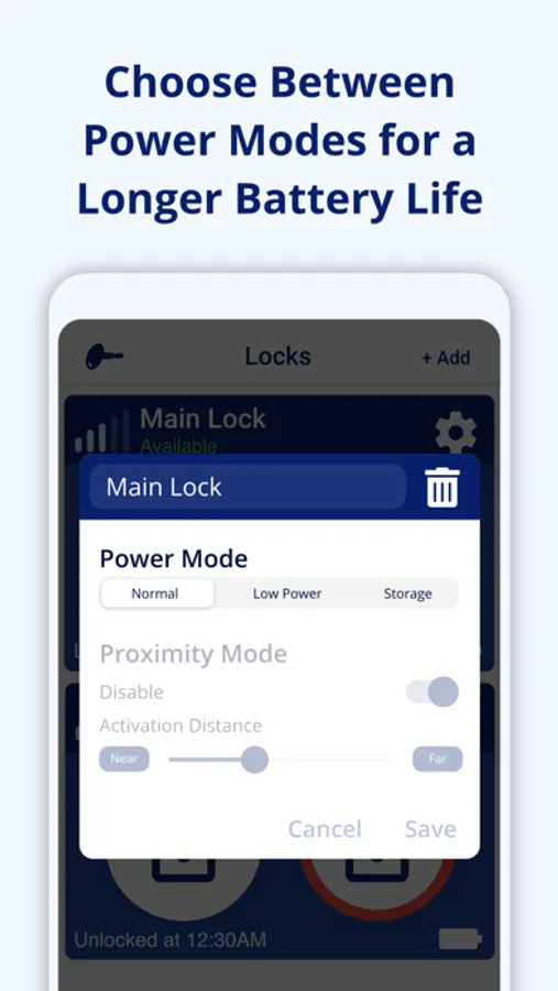 3) Enable storage mode when the lock will not be in use for a long period of time. While storage mode is enabled, the user will be unable to lock/unlock the lock until a different power mode has been selected.