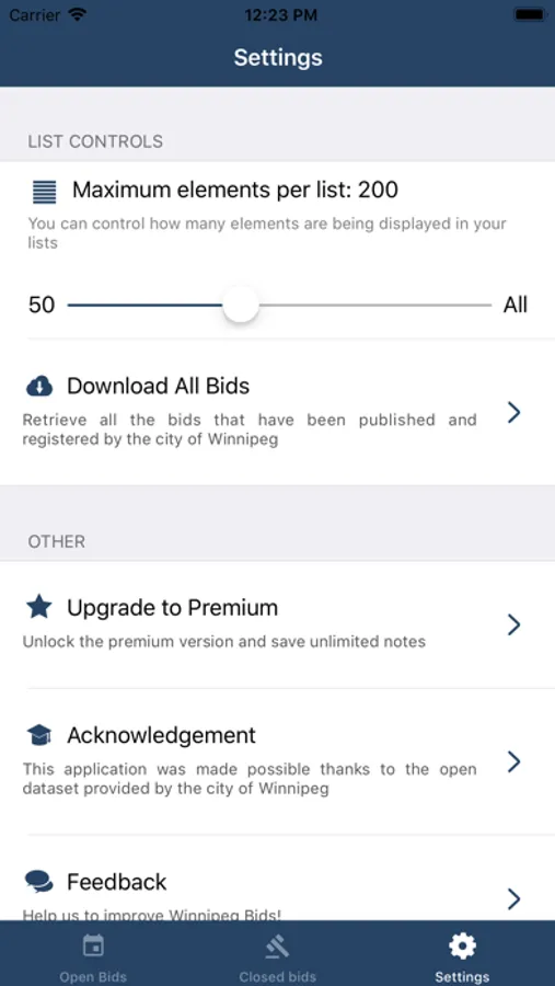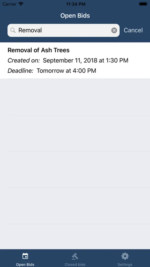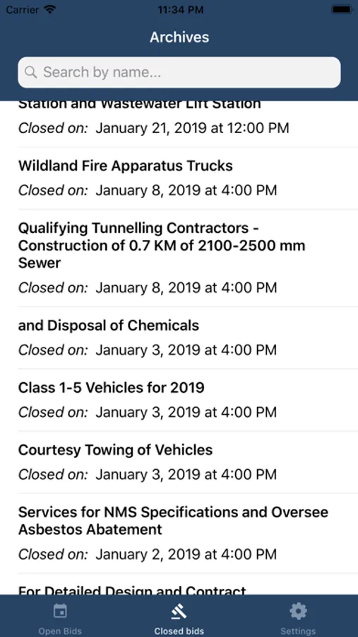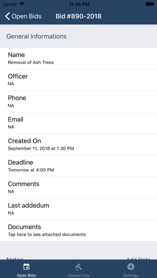 The application is separated between open and closed bids. Closed bid can give you a quick overview of what the city has been requested in the past while open bids give you all information that you'll require to bid on an offer (Bid information, officer, contact, attached documents, etc.). You can also attach your own notes to each bid, but be aware that these notes are only stored locally and won't be retrieved if you uninstall/reinstall the app.