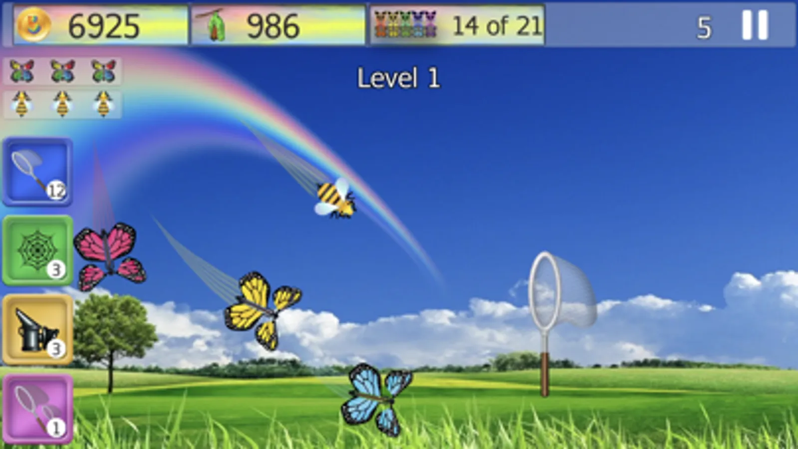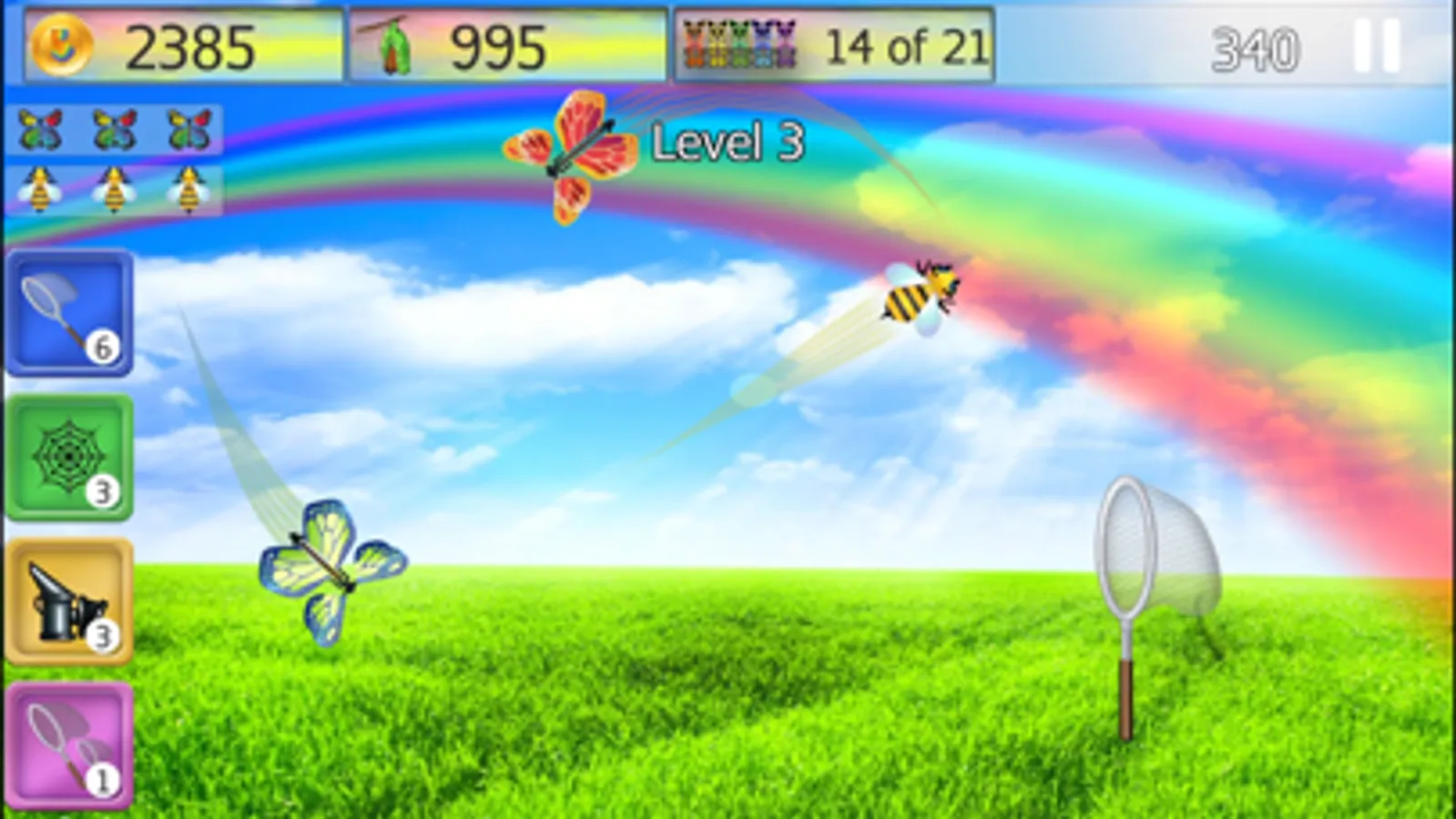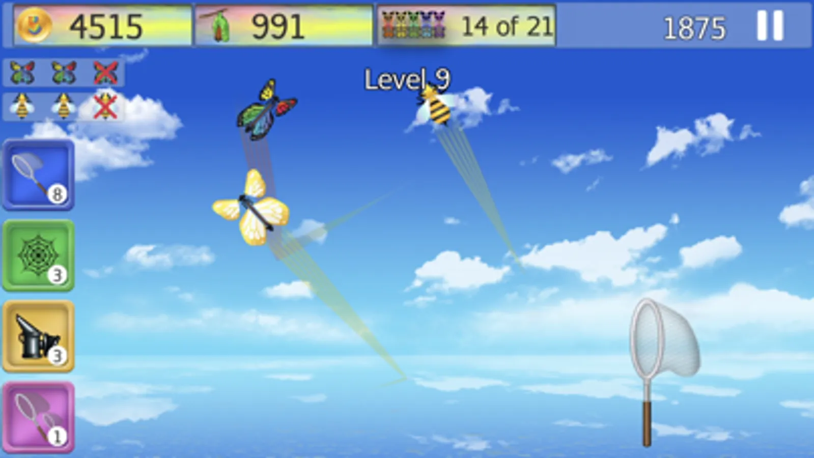 The concept is simple… Use your net to catch the Butterflyers and avoid the Bee! If you hit a Bee, you lose a net. Lose all 3 nets and its, Game Over! It becomes increasingly difficult with every new level as the Butterflyers and the Bee fly faster and faster. Strategically use your Smoker Cans to stun the bee and your Spider Webs to slow the Butterflyers down so you can win more coins and reach the highest levels. See how many coins you can earn and levels you can achieve before you lose all your nets.