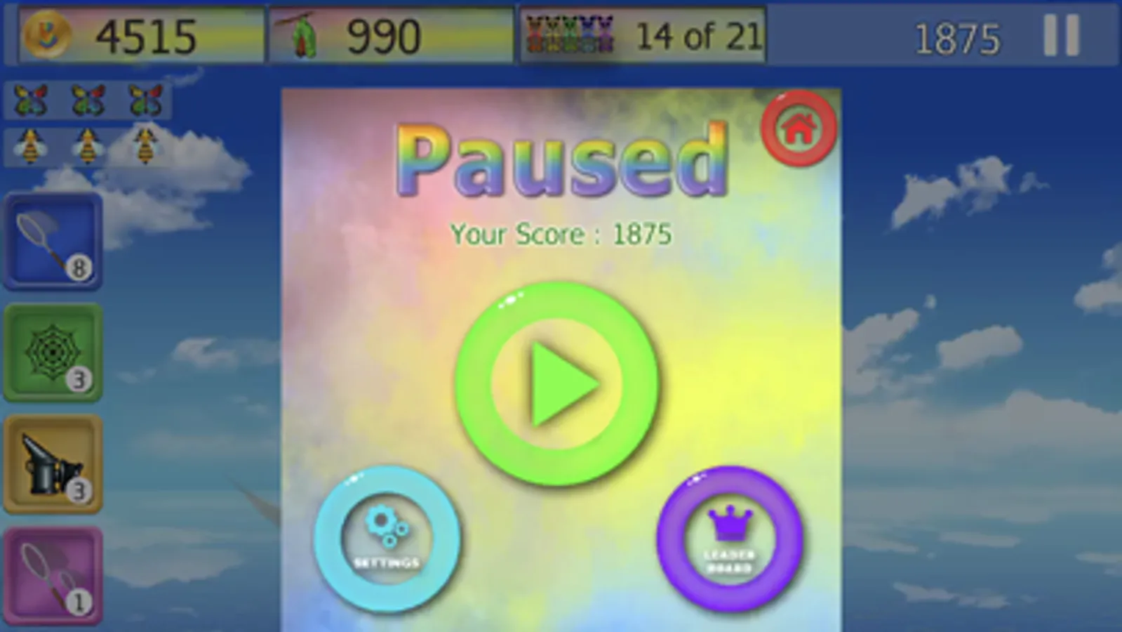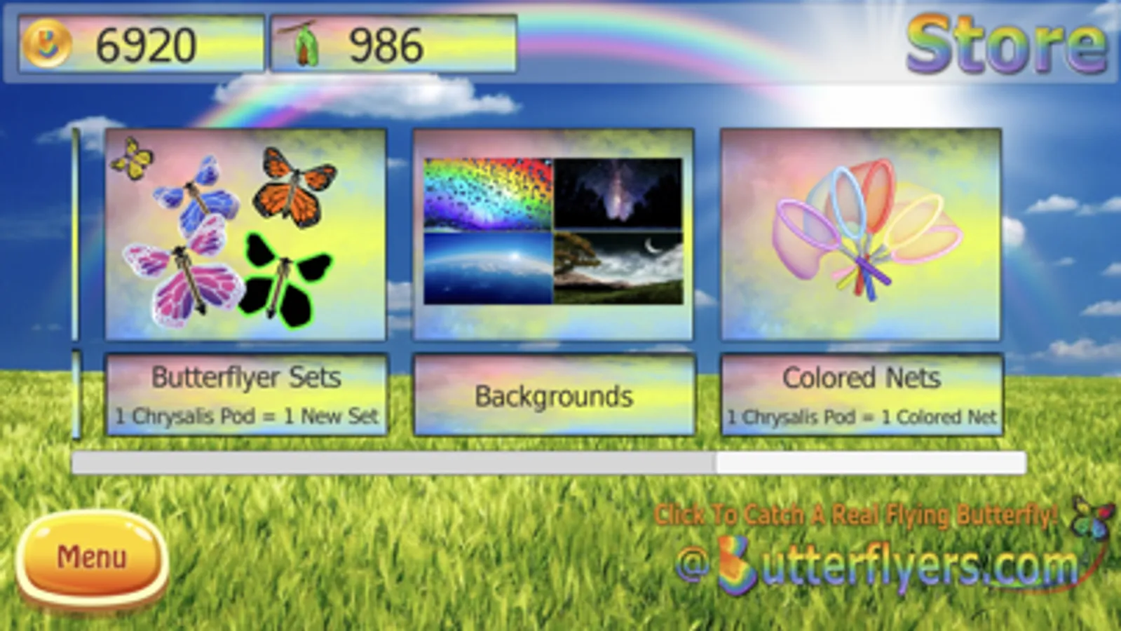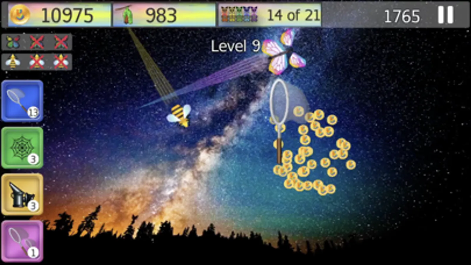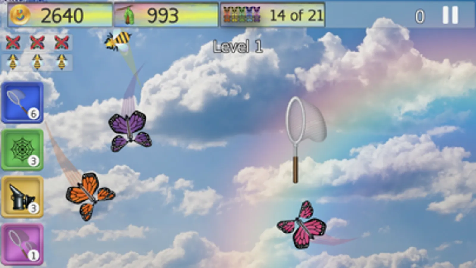 The concept is simple… Use your net to catch the Butterflyers and avoid the Bee! If you hit a Bee, you lose a net. Lose all 3 nets and its, Game Over! It becomes increasingly difficult with every new level as the Butterflyers and the Bee fly faster and faster. Strategically use your Smoker Cans to stun the bee and your Spider Webs to slow the Butterflyers down so you can win more coins and reach the highest levels. See how many coins you can earn and levels you can achieve before you lose all your nets.