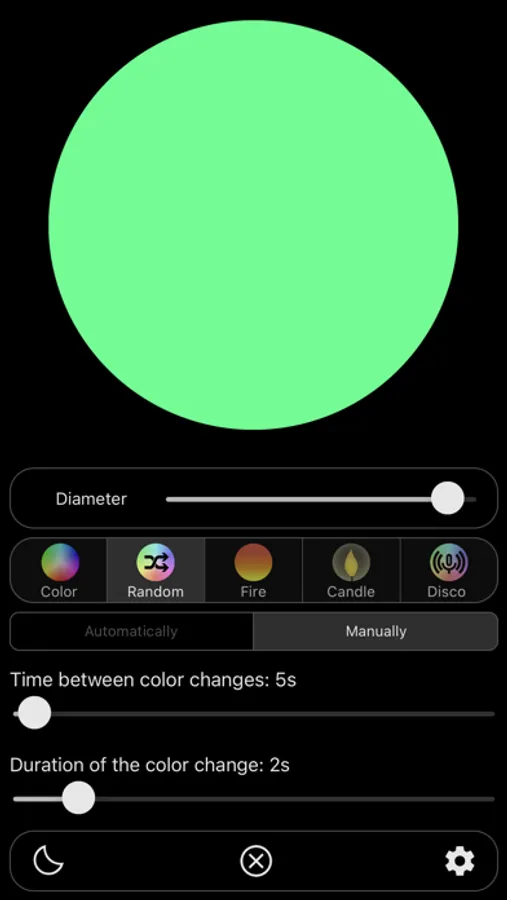 In the second mode, the app will randomly change the color after a certain time. The time intervals are adjustable.