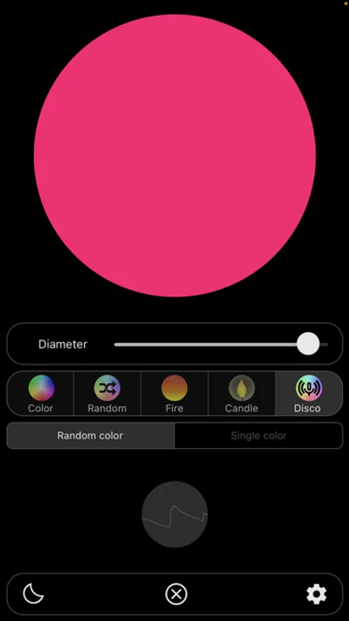 The disco mode requires permission to use the microphone. The light will flash to match the ambient sound. In this mode it is possible to choose between random colors and a single color.