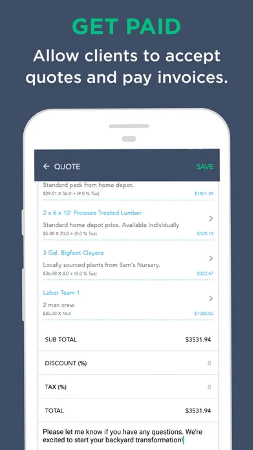 Reduce time spent building quotes with reusable line items then convert leads to clients with quotes that can be accepted online.