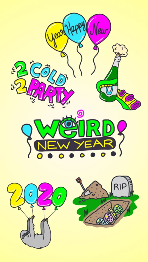 Ring in 2020 with Weird New Year, a sticker pack for iOS! Use these 20+ animated stickers while you celebrate your strange New Years with friends and family.