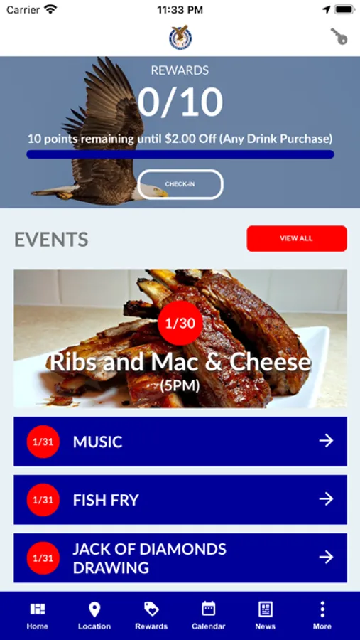 Our app contains all the latest information on what is happening at our Aerie. View our entire Kitchen Menu and upcoming specials. Additionally, be notified when new events are coming up! You can also earn rewards every time you visit the club!