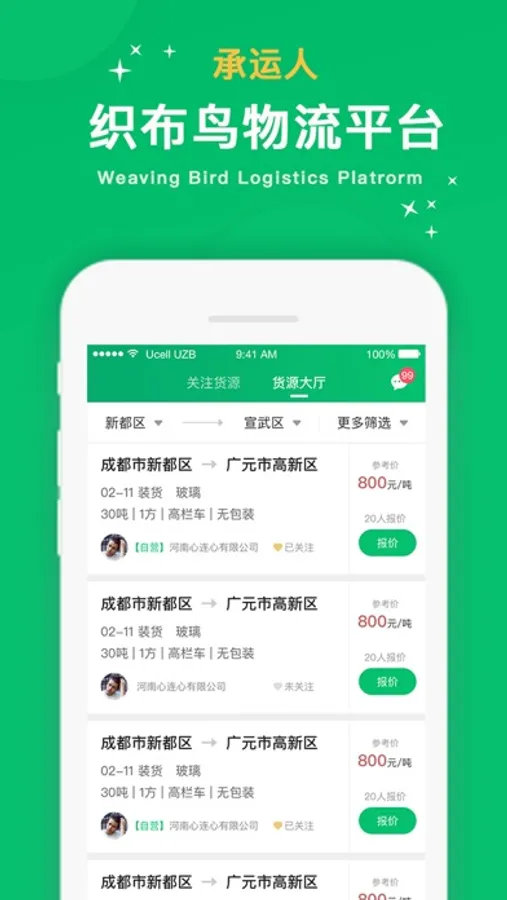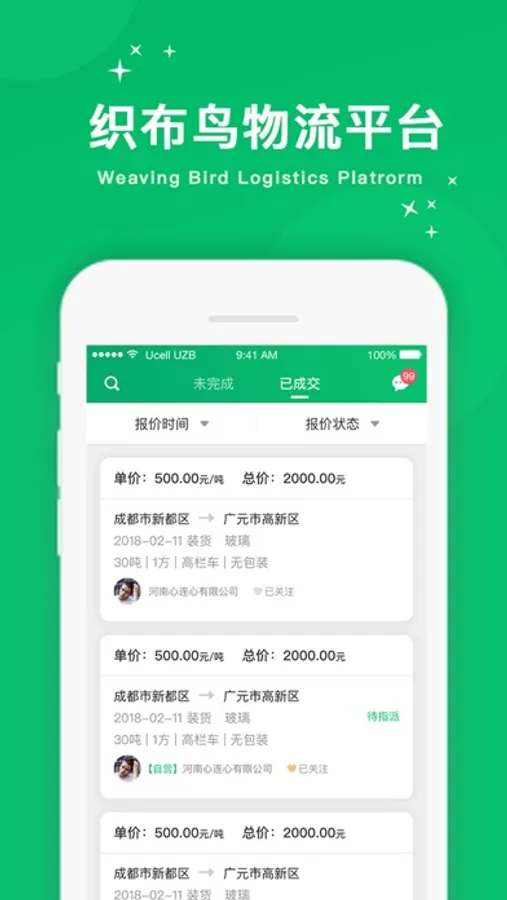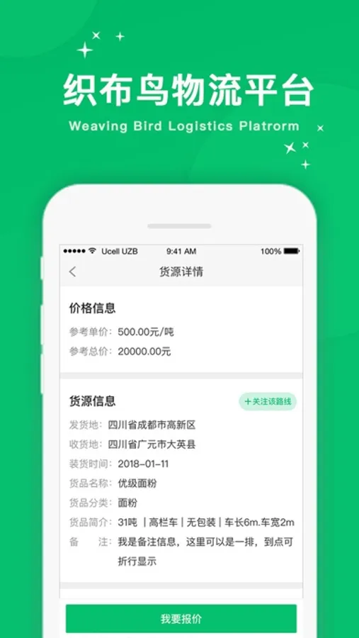 织布鸟物流平台,是五得利面粉集团独立产权,利用集团大宗货物优势,结合互联网技术,通过平台资源整合,为货主、车主交易双方提供高效率、低成本的物流运营环境,降低空驶率、快速周转