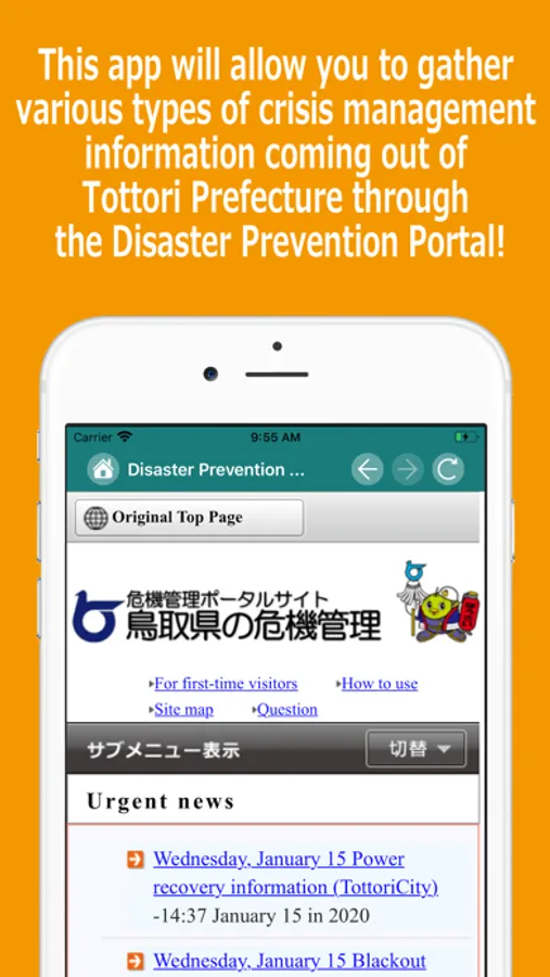 This app allows users to view various types of crisis management information relating to Tottori Prefecture separated by content, such as Tori-Net’s “Tottori Prefecture Crisis Management Portal Site”, “AnshinToripy E-mails”, and “Information Regarding Shelters, Evacuation Areas, and Live Camera Feeds of Rivers and Roads”.