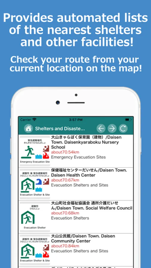 ◆ This Application provides information notifications corresponding to the User’s current location through use of GPS in its displays of lists of “Shelters and Disaster Prevention Cameras”, “Vicinity Information”, and its “Maps and Routes” display function.