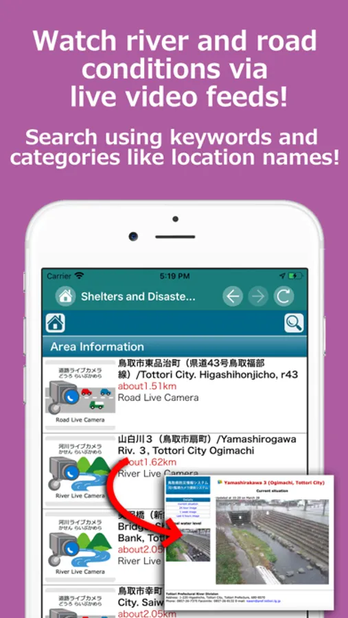 ■ Allows users to view the nearest designated shelters and designated evacuation areas in Tottori Prefecture, examine lists and descriptions of disaster prevention live cameras (roads and rivers), check positioning maps for each location (automatic routing guidance), and view live feeds of live cameras.