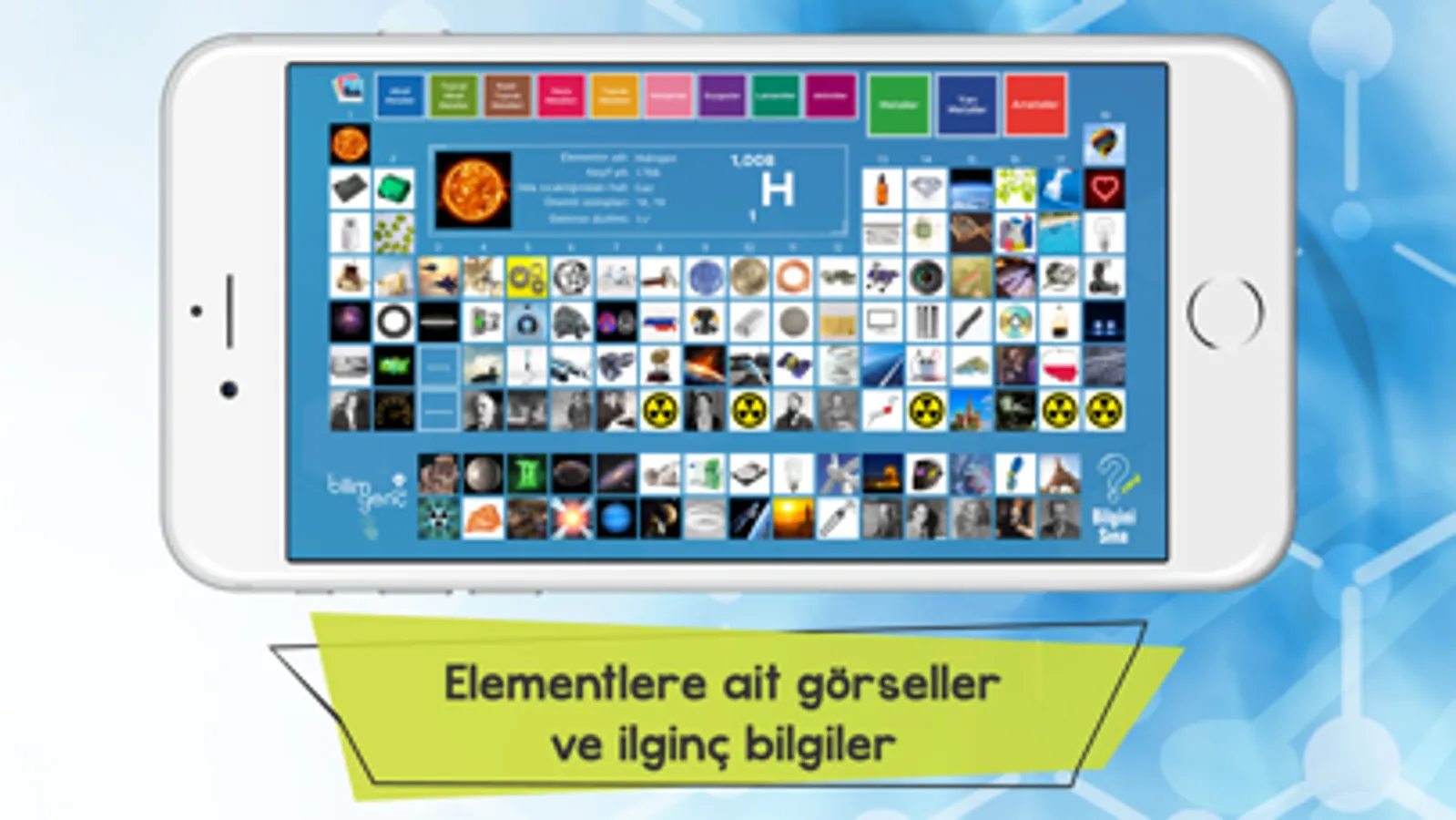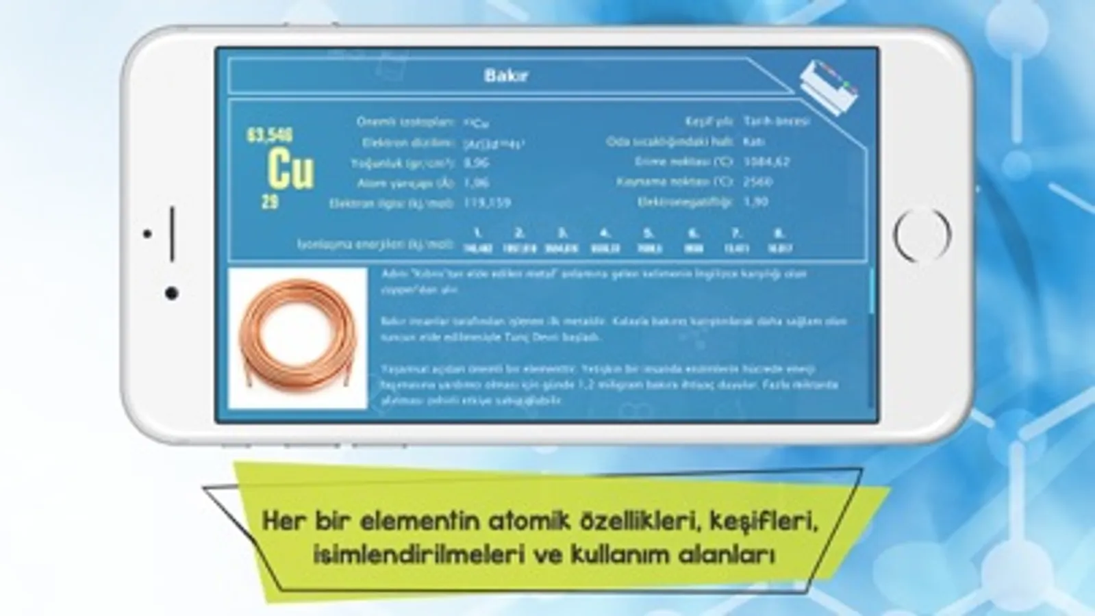 Sizler için hazırladığımız uygulamada periyodik tablodaki her bir elementin niceliksel özelliklerinin yanı sıra keşfine dair ilginç bilgileri, ismini nereden aldığını, günlük hayattaki kullanım alanlarını, insan vücuduna etkilerini ve bilimsel amaçlı nasıl kullanıldığını açıkladık. Uygulamada sunduğumuz başlıklarla tüm elementleri farklı sınıflama yöntemlerine göre filtreleyebilir, her bir başlıkta kaç element olduğunu görebilirsiniz. Elementlerin kullanım alanları, kaynakları ve kimyasal özelliklerine dair birbirinden ilginç fotoğraflara da yer verdiğimiz mobil uygulamayla elementleri tanımak artık daha keyifli olacak!