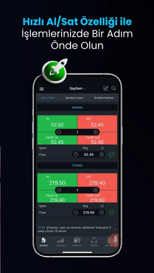 Bir çok ekrandan hızlıca emir gönderebileceğiniz Al-Sat kısayolları ve yenilenmiş Emir Ekranları, Hızlı Al-Sat ve portföy takip ekranları ile piyasa hızına ayak uydurun.