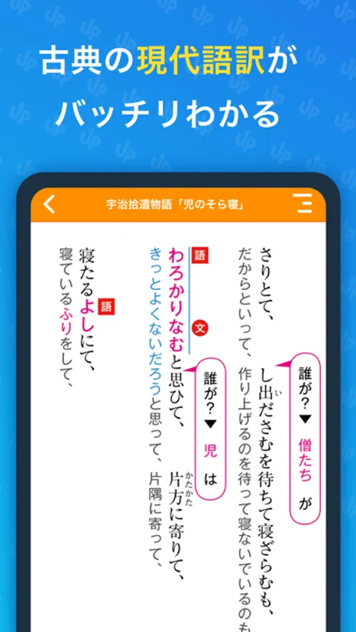 素材文全文の現代語訳を見ることができ、古文でよく問われる主語・指示語や品詞分解も「ON」「OFF」ボタン一つで確認できます。