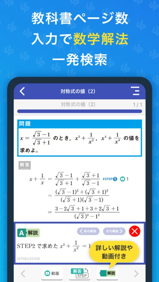 教科書・副教材に掲載されている問題の類題をすぐに検索できます。類題を元に「解き方」をSTEP解説・詳細解説の2段階で確認できるため、汎用的な「解く力」が身に付きます。