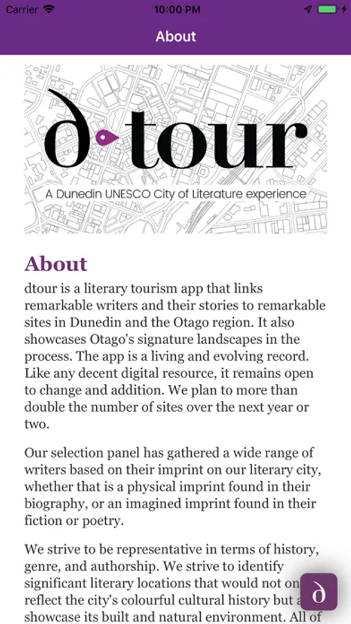 dtour is a literary tourism app that links remarkable writers and their stories to remarkable sites in Dunedin and the Otago region. It also showcases Otago's signature landscapes in the process. All of the literary sites are underpinned by anecdotes - the understory, so to speak, that generates and regenerates the literary ecosystem of Dunedin, New Zealand.