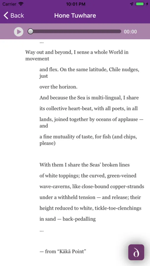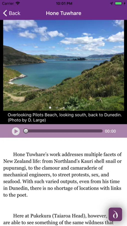 You can search dtour via the map, where you can select from "biographical" sites and "literary" sites. Or search via the list, which displays authors alphabetically. Push play to hear the text for each site read by iconic New Zealand voices.