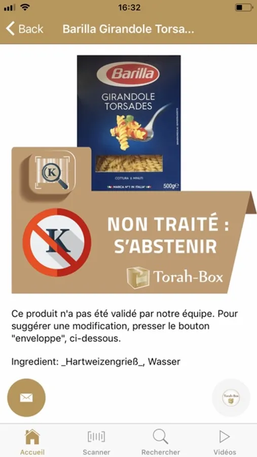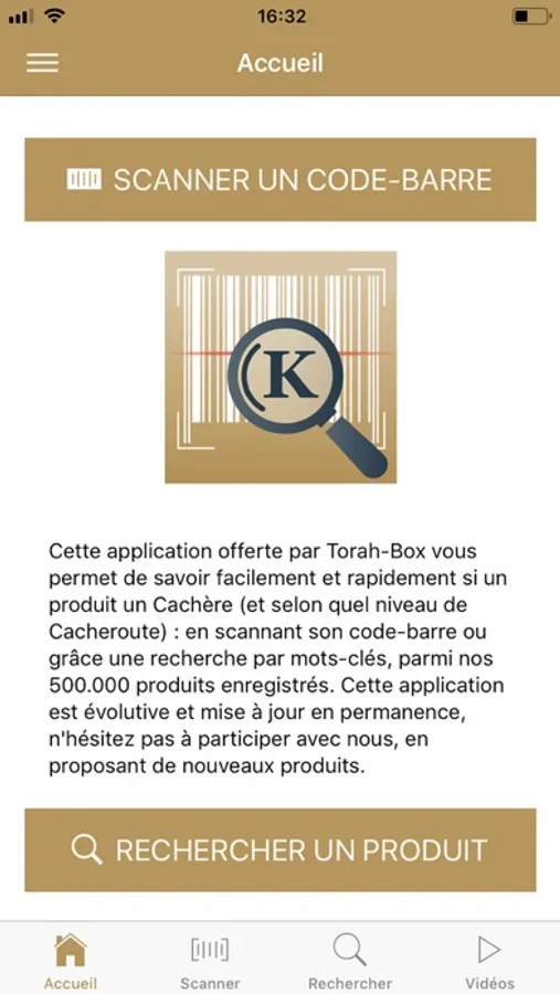 Cette application offerte par Torah-Box vous permet de savoir facilement et rapidement si un produit est Cachère (et selon quel niveau de Cacheroute) : en scannant son code-barre ou grâce une recherche par mots-clés, parmi nos 500.000 produits enregistrés.