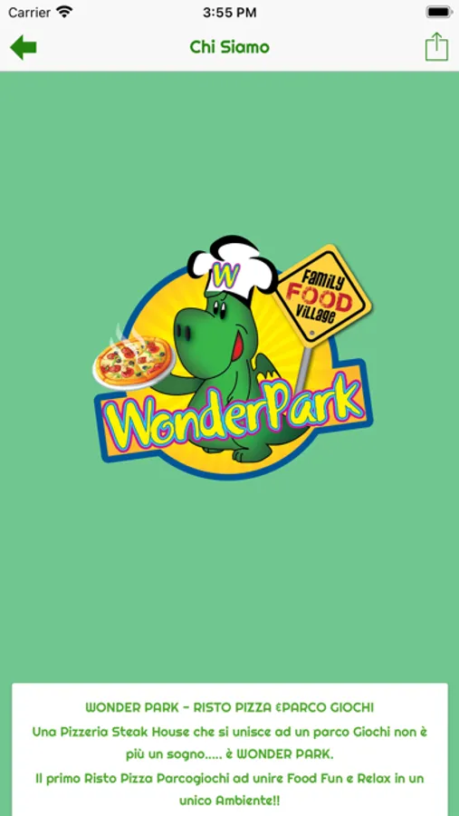 WONDER PARK - RISTO PIZZA &PARCO GIOCHI Una Pizzeria Steak House che si unisce ad un parco Giochi non è più un sogno..... è WONDER PARK. Il primo Risto Pizza Parcogiochi ad unire Food Fun e Relax in un unico Ambiente!! Non solo un Parco Giochi e non solo una Pizzeria.... ma un vero e proprio FAMILY FOOD VILLAGE per il divertimento e gli Eventi giusti per la tua famiglia!!!! I tuoi figli giocano e tu ti rilassi a due passi da loro, grazie al Nosto Esclusivo concetto Open Space......Bimbi sempre in vista dal tuo tavolo!!! Da quest'anno apre SUMMER PARK la nuova area esterna in cui vivere WONDER PARK anche in estate, sia con l'Area RISTORO, che giochi collegata in vista a due passi dai tavoli, per una serata Relax con i tuoi figli sempre a due passi da te nella massima sicurezza!!!!